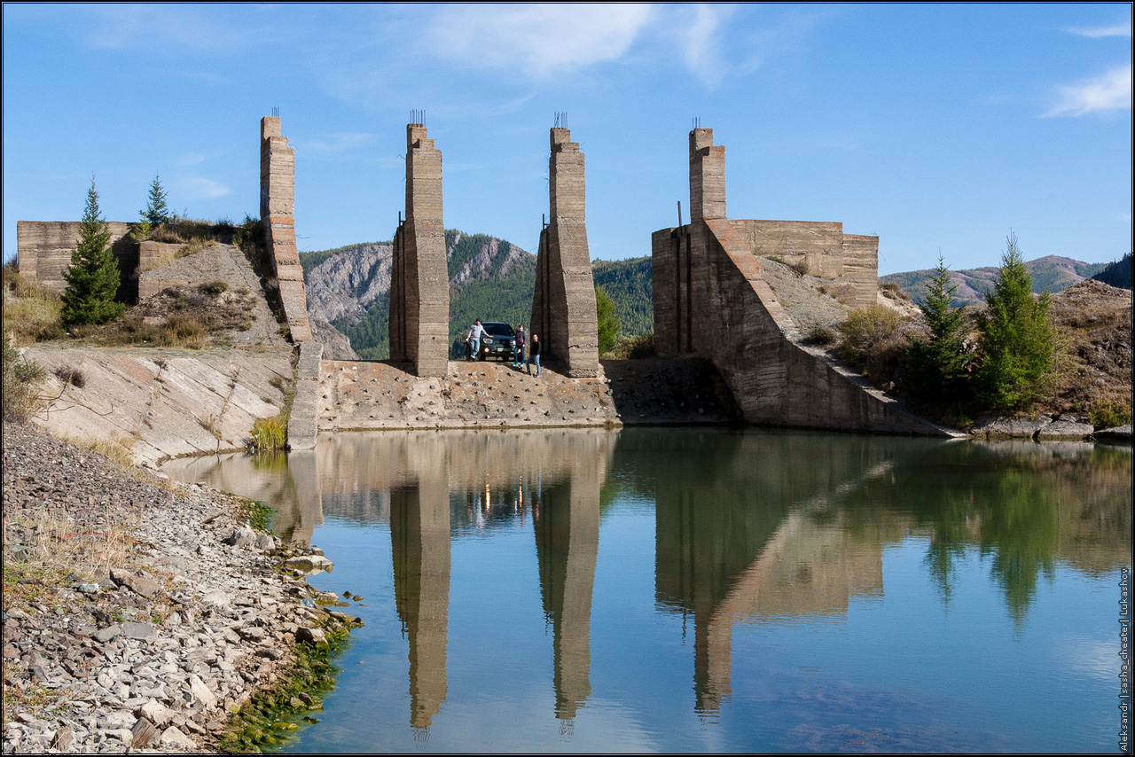 По дороге наткнулись на запись в Викимапии о руинах недостроенной ГЭС, которая должна была перекрыть реку Чуя выше по течению от уже упоминаемого ранее села Акташ. ГЭС почти достроили, но внезапно оказалось что качество работ, проводимых стройотрядами крайне низкое, экологию нарушат, да и вообще стройку сильно затянули, в итоге оборудование сдали в металлолом, а что осталось, то видно на фотографии: