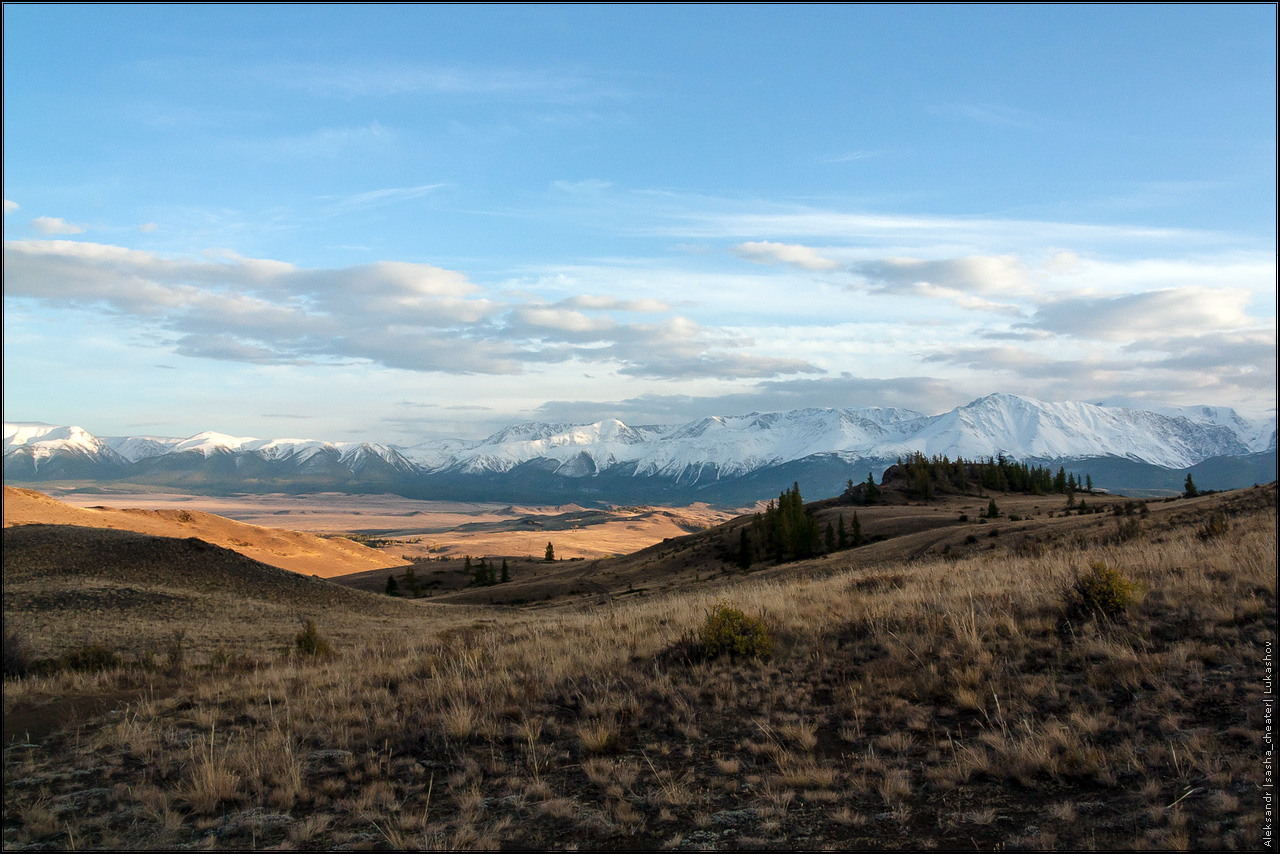 На обратном пути уже начинался закат, и мы решили снова заехать на холм в Курайской степи, но уже с другой стороны от дороги, поймать Северо-Чуйские вершины в лучах заката: