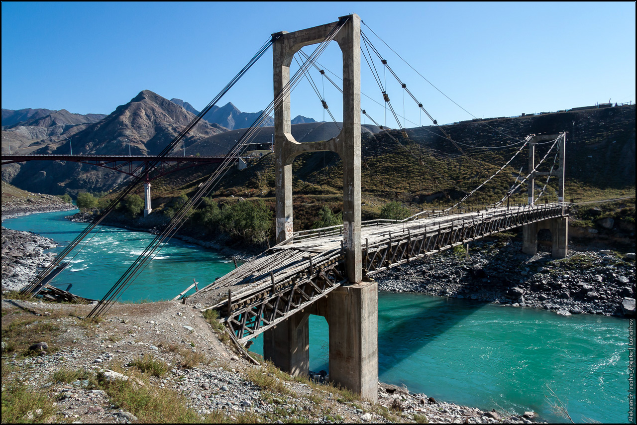 На этом путешествие продолжилось в сторону дома, виды становились попроще, горы все менее высокими, и хотелось развернуться обратно. На обратном пути практически не фотографировали, разве что заехали в село Иня посмотреть на старый подвесной мост через Катунь. Вода, конечно же, волшебного осеннего бирюзового цвета.