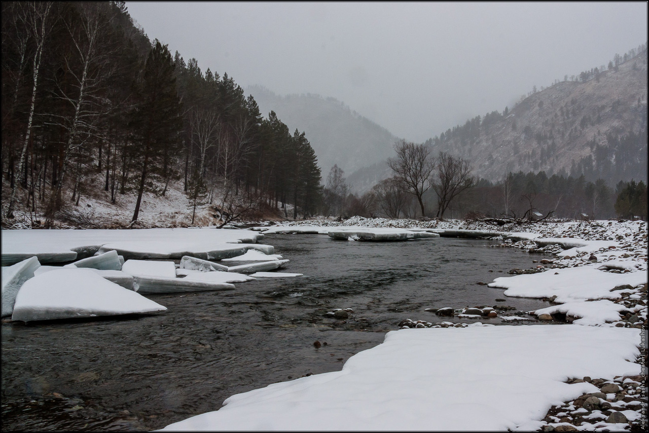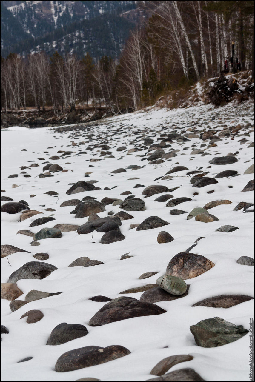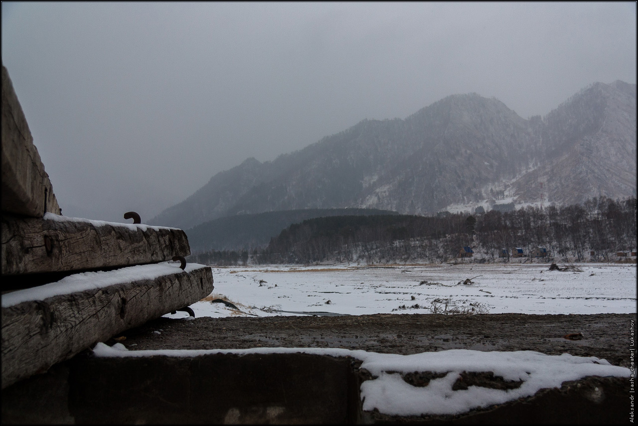 На самом деле, не все так мрачно и печально, как может показаться на первый взгляд 🙂 Просто была отличная погода — ночью сантиметров 15 снега, днем +3 и капель, превращающаяся в ручьи среди камней. Прокатились до Чемала, посмотрели на последствия прошлогоднего наводнения — земляная плотина ГЭС смыта к черту, вместо водохранилища засыпанное валежником и песчаными наносами поле с речкой посередине. С плотины сняты все шлюзы, вода просто течет по водосбросу. Печальный вид, даже показывать не буду.