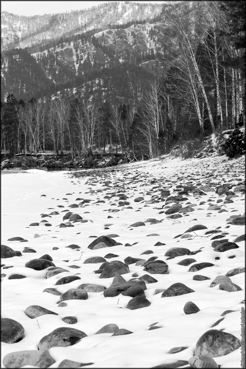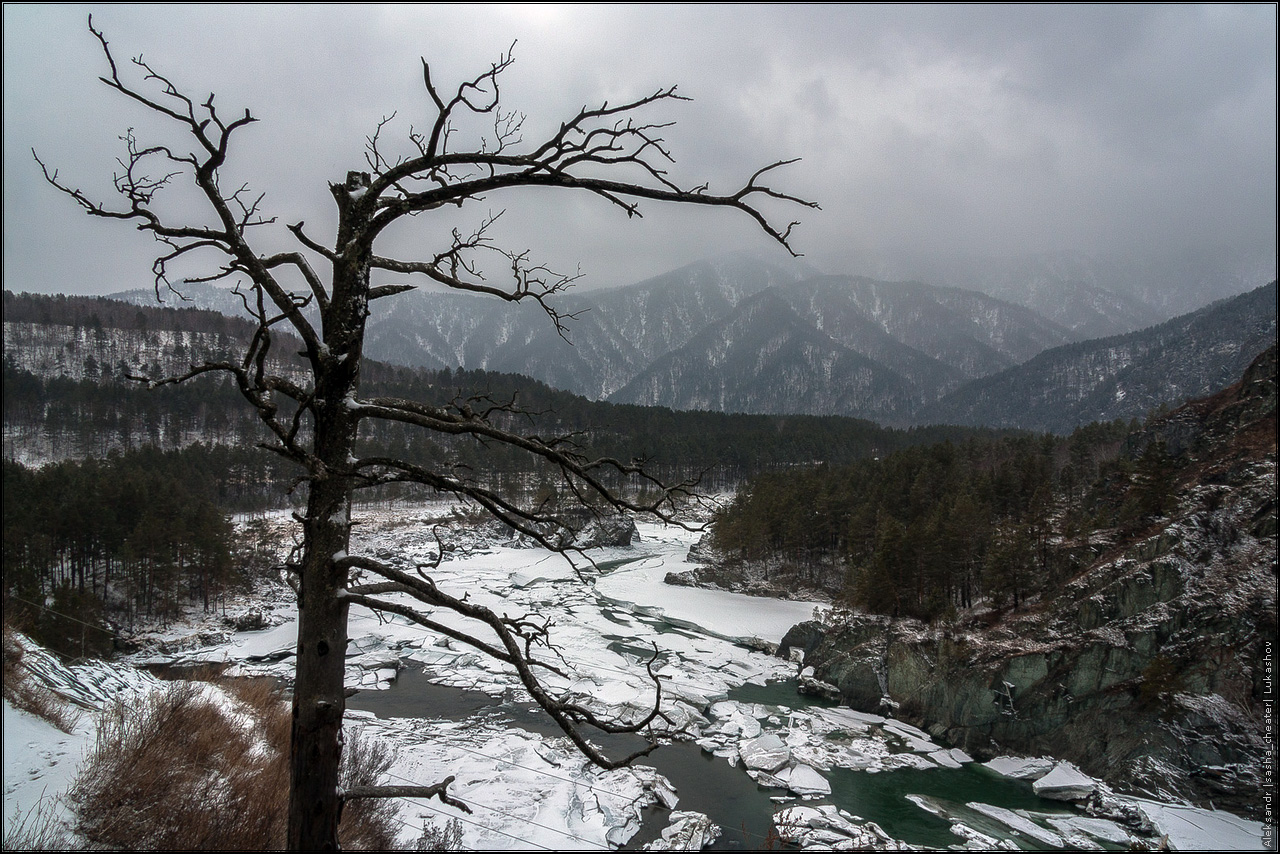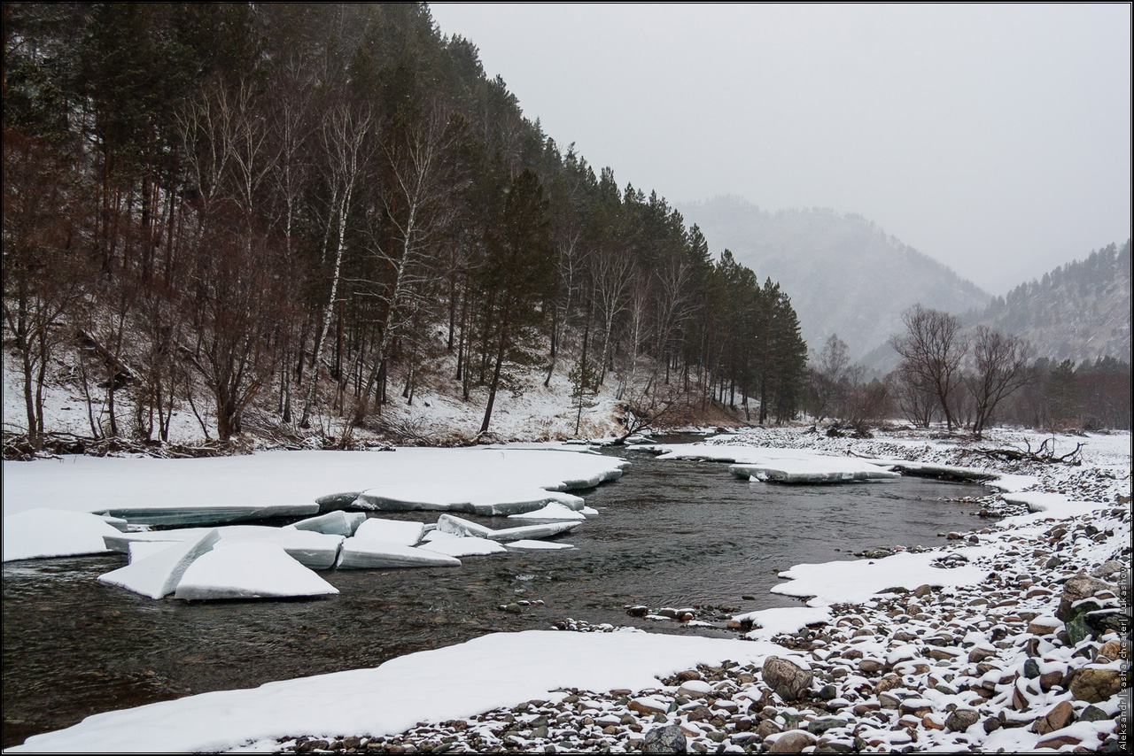 На самом деле, не все так мрачно и печально, как может показаться на первый взгляд 🙂 Просто была отличная погода — ночью сантиметров 15 снега, днем +3 и капель, превращающаяся в ручьи среди камней. Прокатились до Чемала, посмотрели на последствия прошлогоднего наводнения — земляная плотина ГЭС смыта к черту, вместо водохранилища засыпанное валежником и песчаными наносами поле с речкой посередине. С плотины сняты все шлюзы, вода просто течет по водосбросу. Печальный вид, даже показывать не буду.