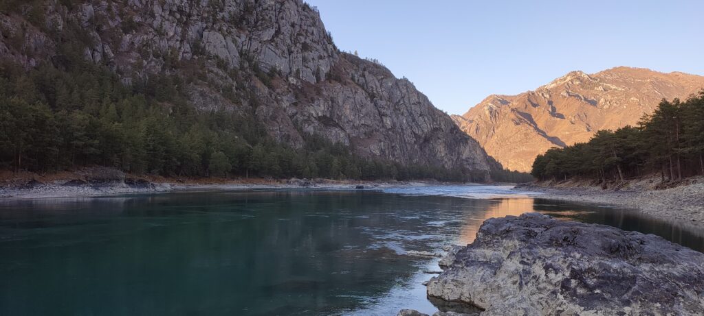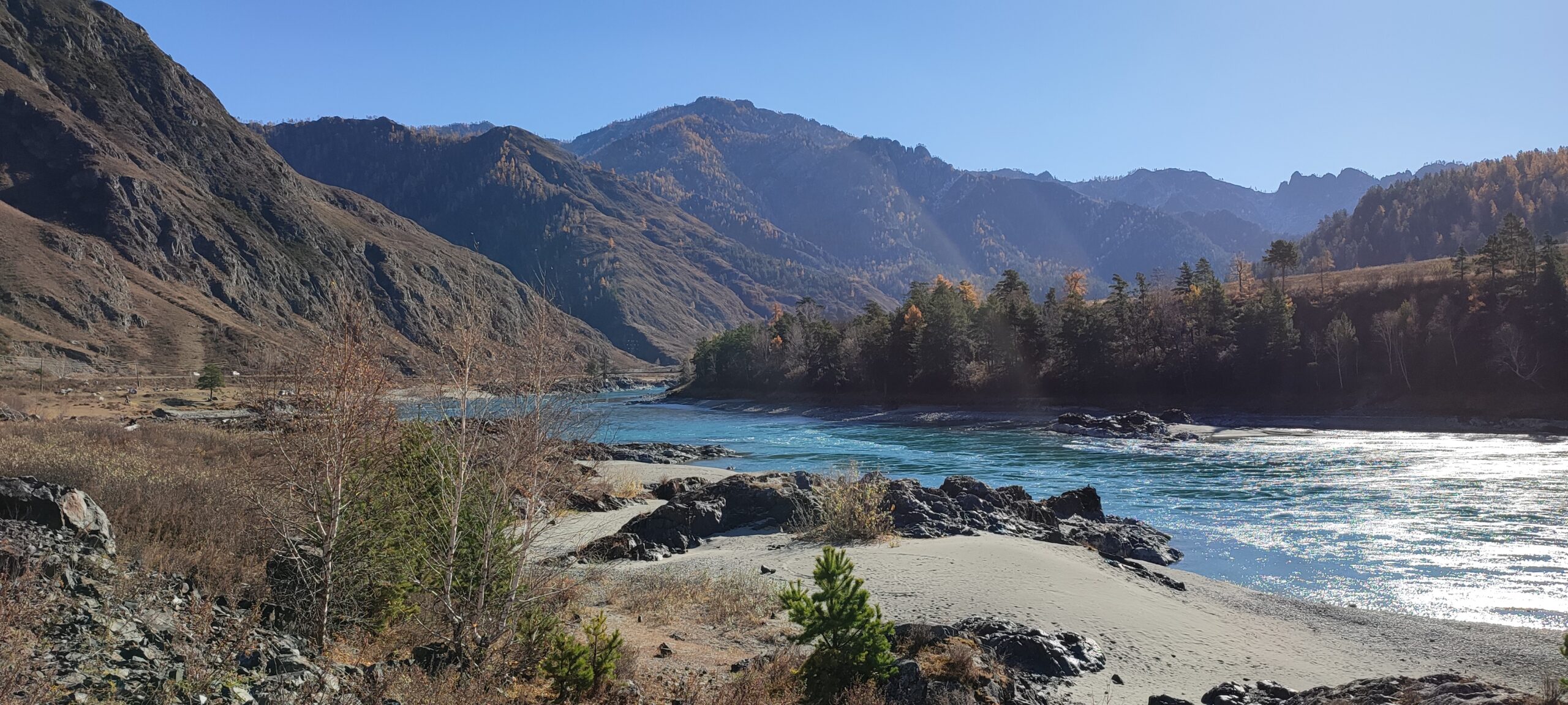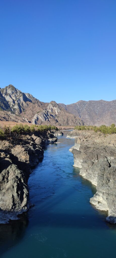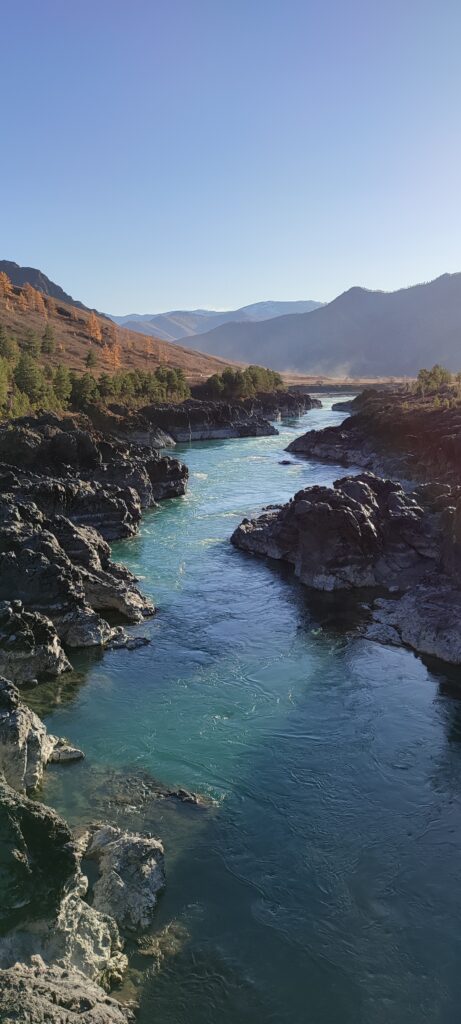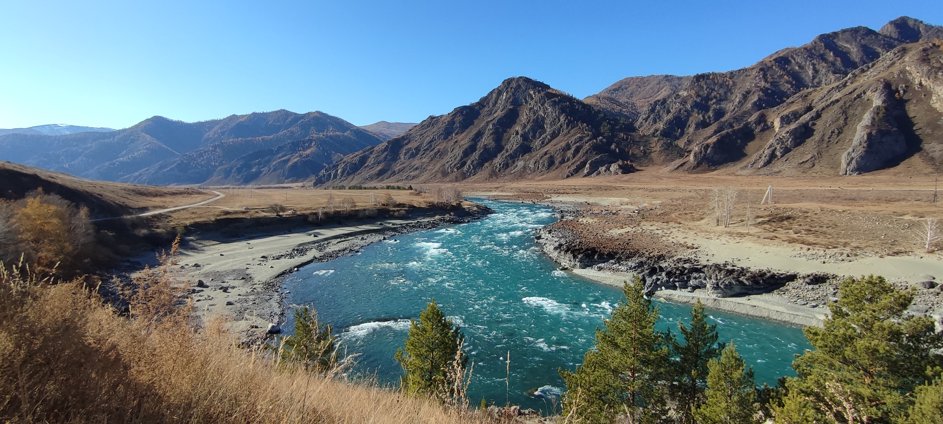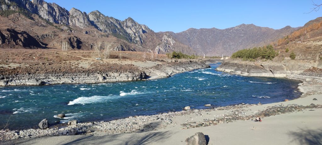 Каких-то 45 км от Чемала, а уже совершенно другой пейзаж, другое течение реки, гораздо выше горы и преобладание степных пейзажей над лесными.