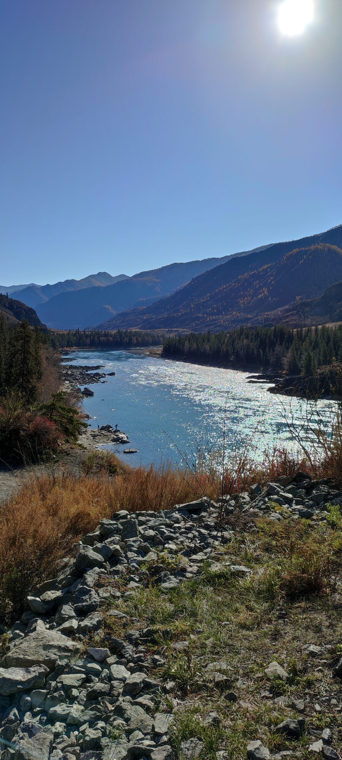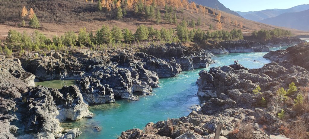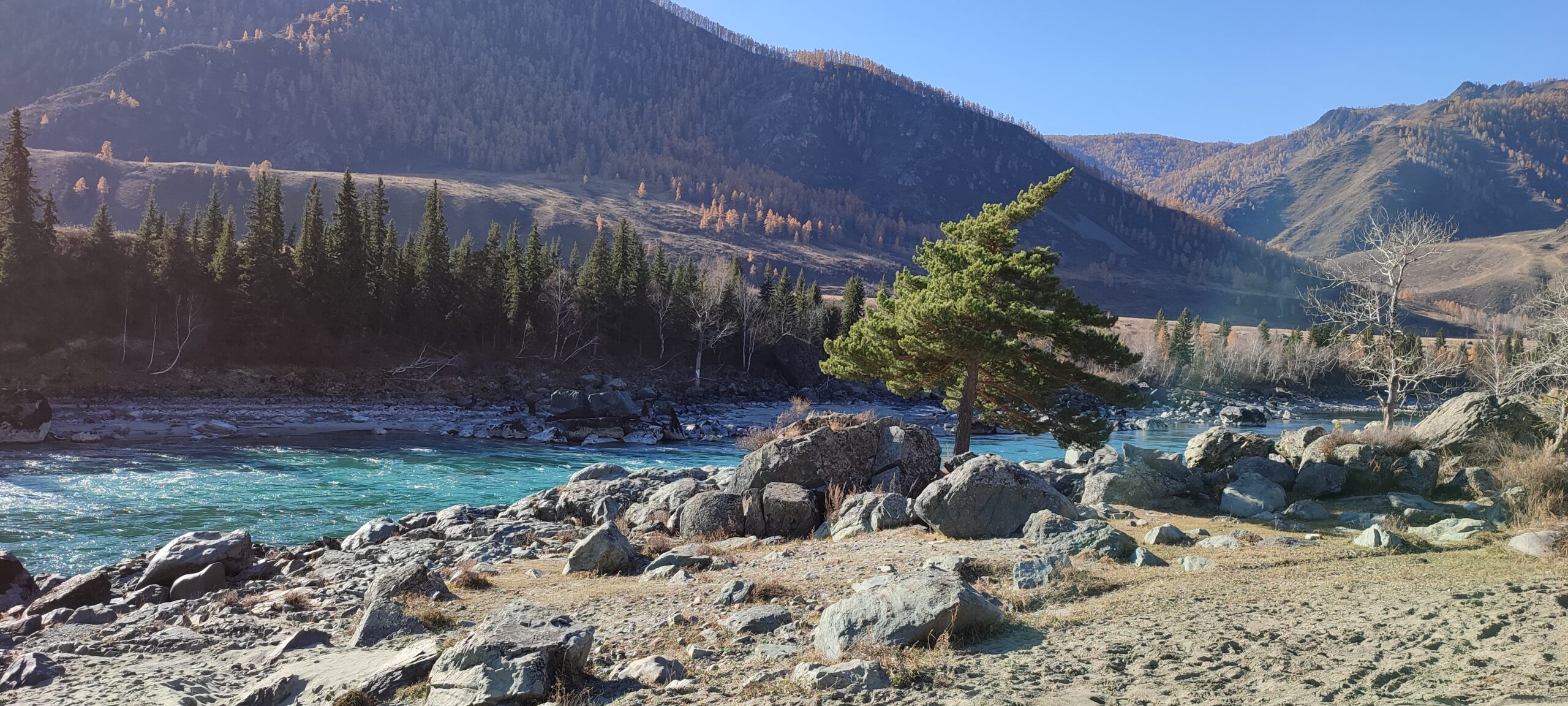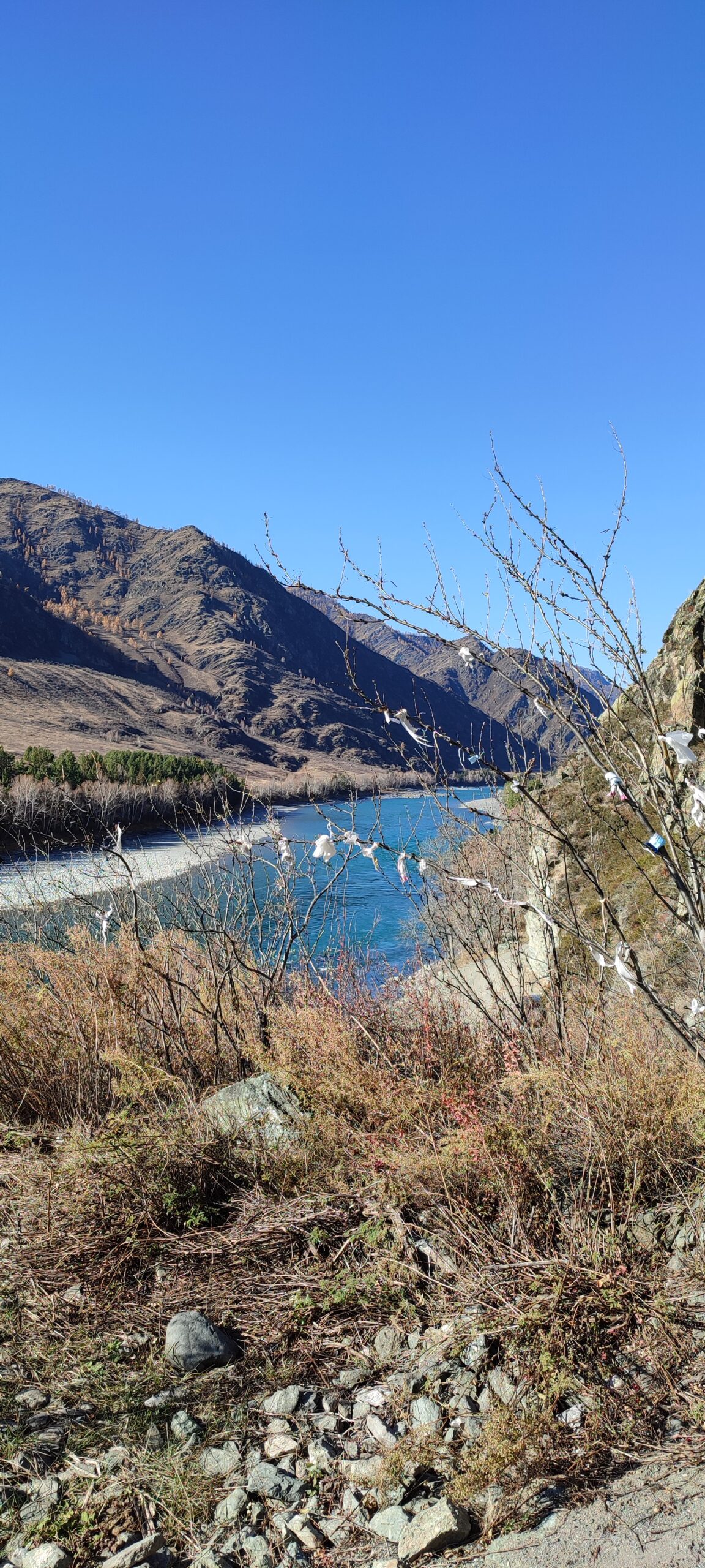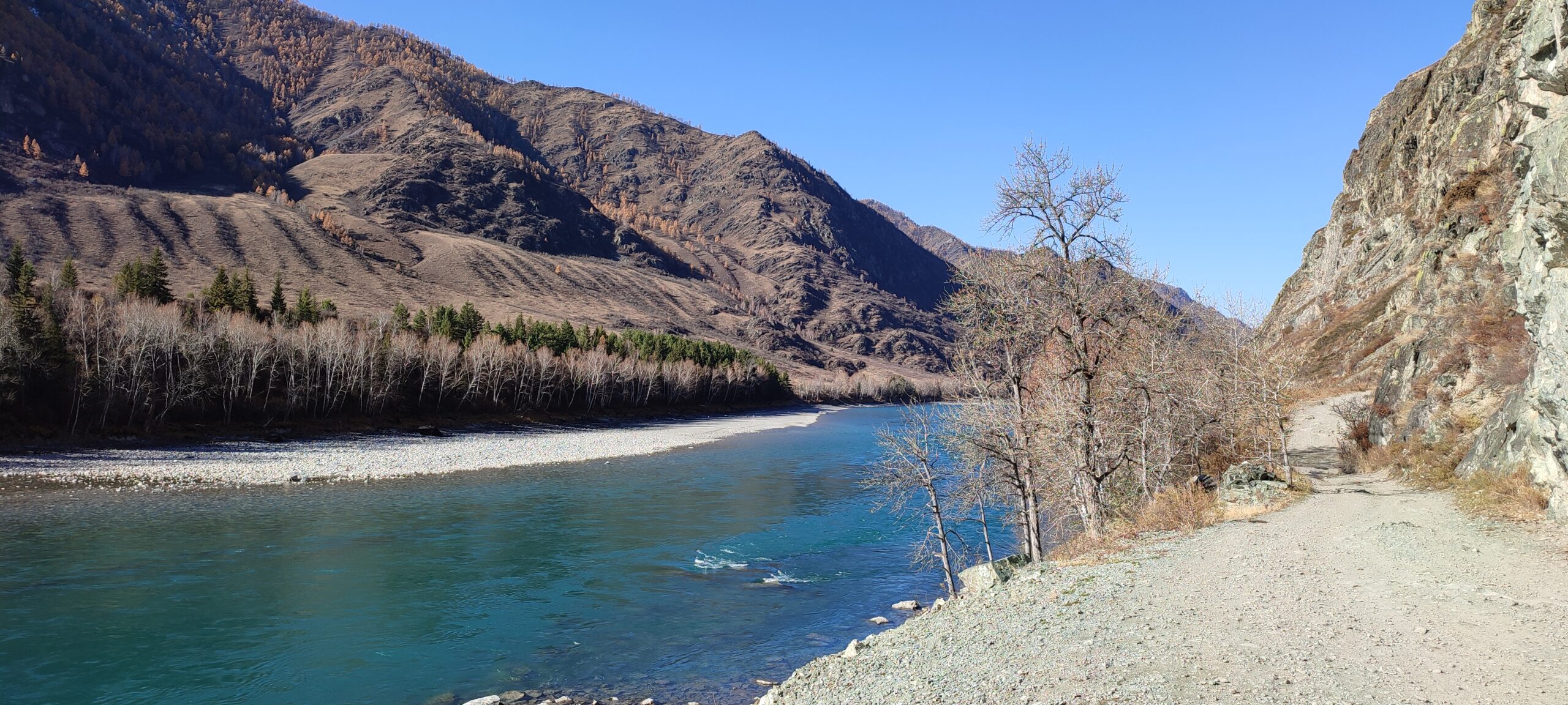 Каких-то 45 км от Чемала, а уже совершенно другой пейзаж, другое течение реки, гораздо выше горы и преобладание степных пейзажей над лесными.