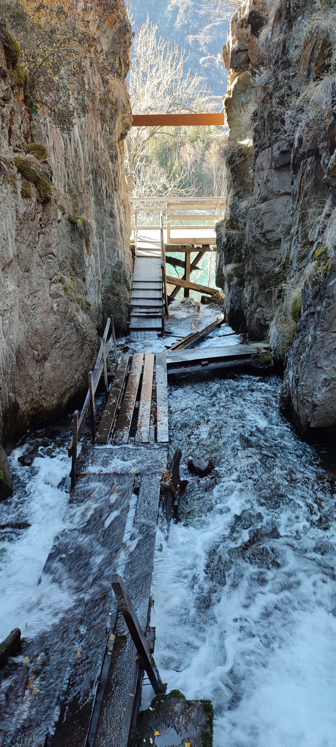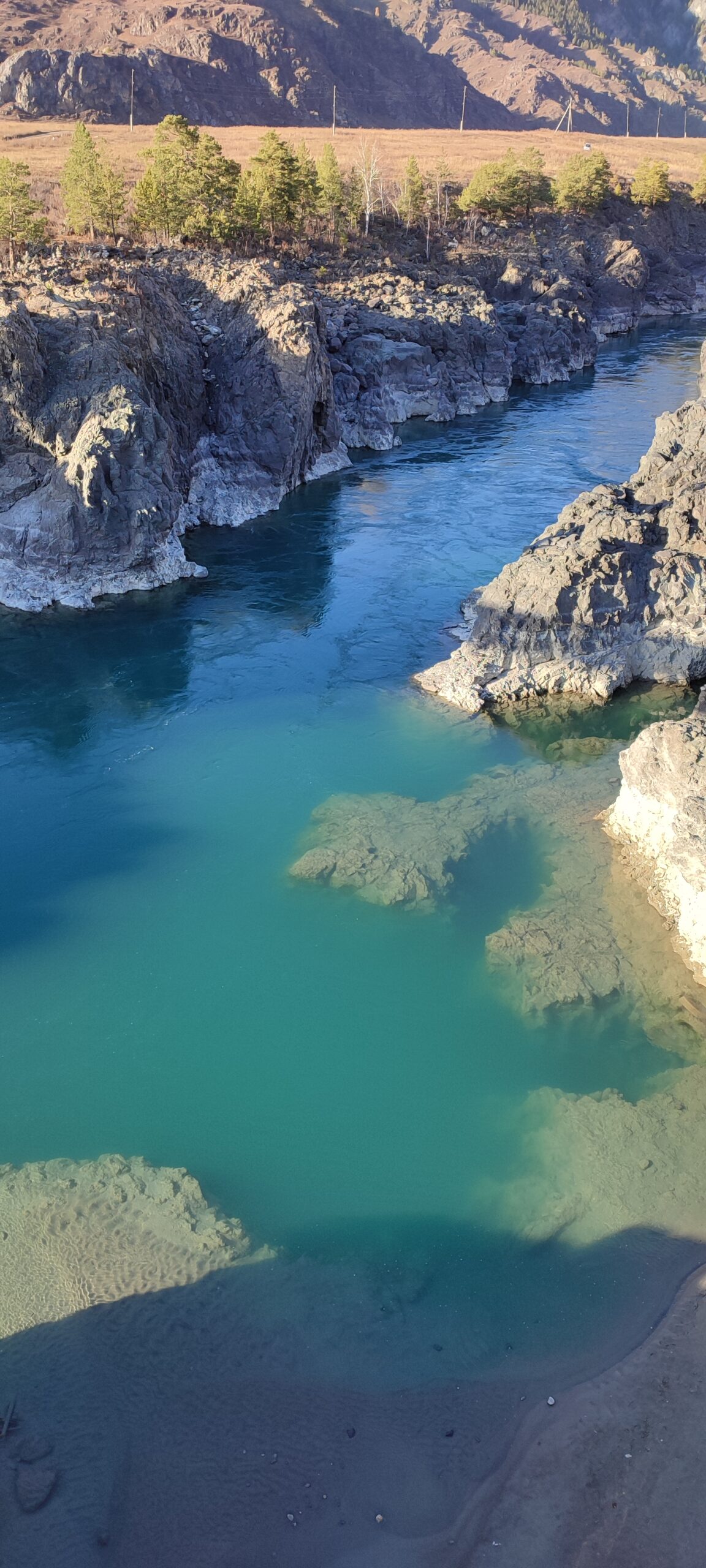 Оказывается, согласно данным той же Wikimapia, в месте где построен Ороктойский мост, Катунь имеет самую узкую ширину русла, всего 20 метров при глубине 70 метров, что хорошо видно издалека, как на фотографии расположенной сверху. Этакое узкое ущелье между скал, заполненное ледяной водой, бирюзовой по осени и молочной в сезон летнего паводка. Просто берёшь 20-ти этажный дом, бульк, и сквозь прозрачную воду просвечивает лишь его кровля с торчащими вентиляционными трубами. Но конечно возникает вопрос: от какого места стоит измерять эти 70 метров глубины — от линии побережья, или от среднего уровня воды в реке?..