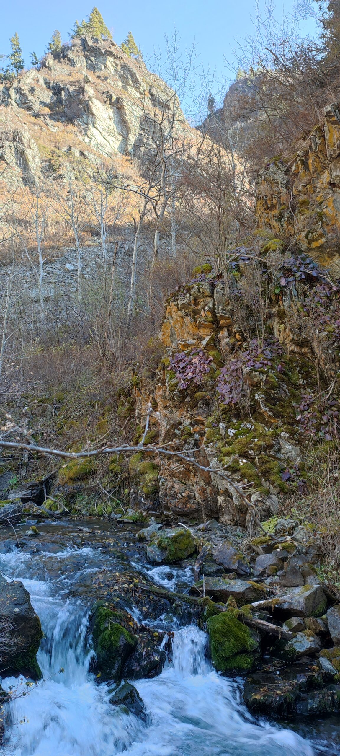 Сам водопад Бельтертуюк небольшой, высота падения воды 10 метров, он располагается в ущелье между двух скал, как будто в коридоре за ширмой. За водопадом есть пологий подъем на гору, можно заехать на подготовленном автомобиле, комментаторы с Wikimapia говорят, что вверху нас ждут пастбища и местные аналоги альпийских лугов. Сверху над водопадом река скатывается с нескольких порогов, пересекает дорогу под небольшим самодельным мостиком, и, ближе к вершине ущелья, успокаивается, начиная течь сквозь небольшую берёзовую рощу. Из ощущений на момент посещения — довольно ветреное место, при том что во всех остальных локациях стоял практически полный штиль.