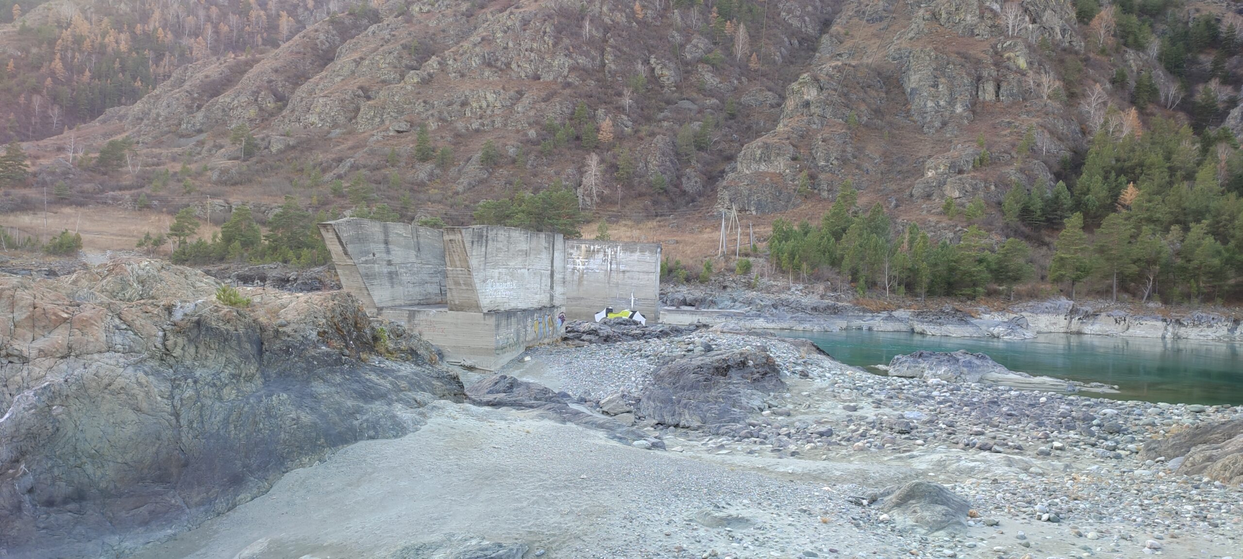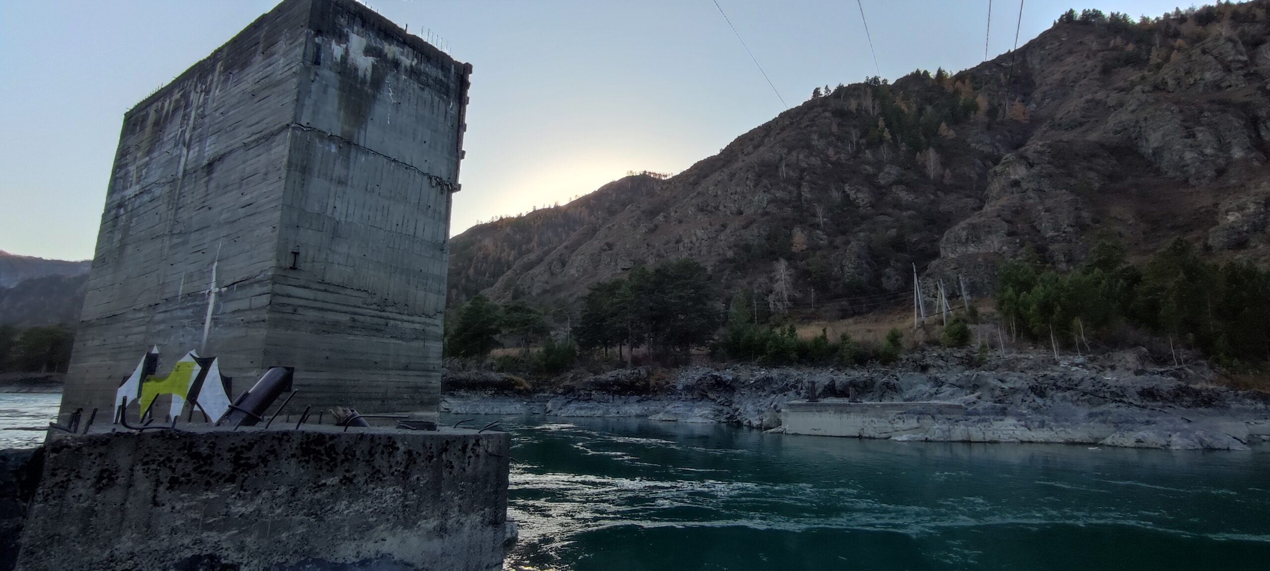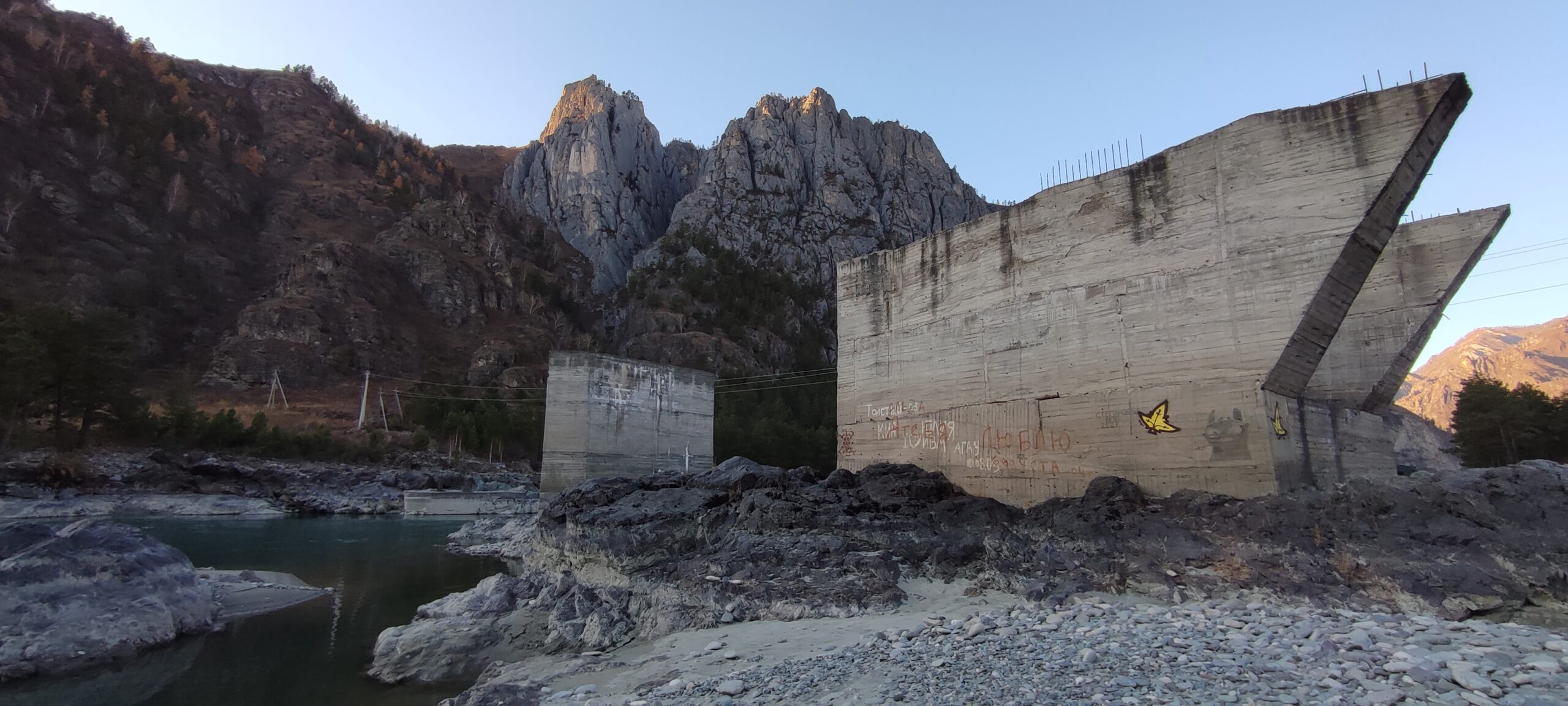 После осмотра моста заехали на заброшенную стройку Катунской ГЭС, расположенную недалеко от села Еланда. Опять же согласно данным Wikimapia, это недостроенные опоры для плотины, но по моему мнению это больше похоже на опоры моста через реку, чем на водослив гидроэлектростанции. Взять для примера ту же заброшенную Акташскую ГЭС — совершенно другая форма конструкций.